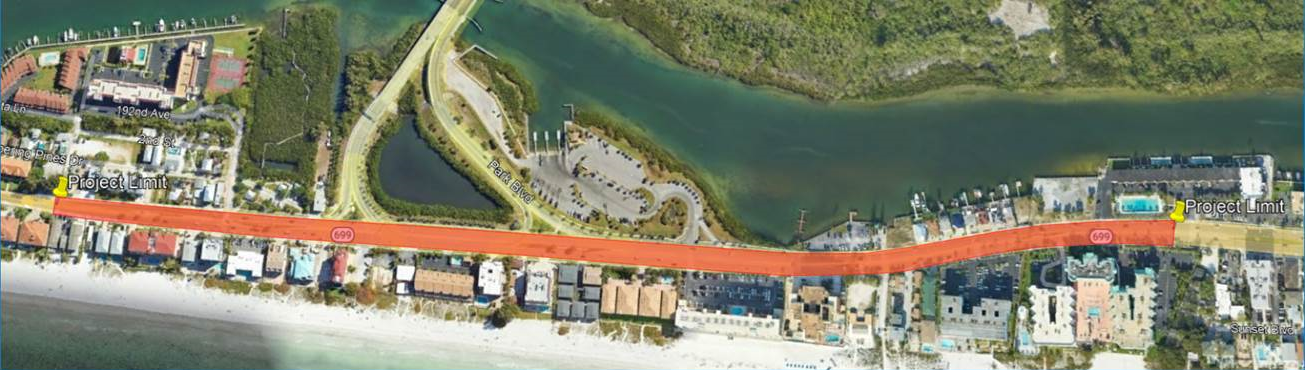 Project location is SR 699 (Gulf Blvd) starting at 192nd Ave, and ending just north of 183rd Terrace W Dr. Work consists of day shift roadway resurfacing, with lane closures. See graphic below for project limits.
