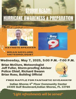 for our annual "Storm Ready: Hurricane Awareness & Preparation" seminar, happening Wednesday, May 7, 2025, in the 4th Floor Community Room at Town Hall (19305 Gulf Blvd.), beginning at 5 p.m. (Click on flyer thumbnail to view.)