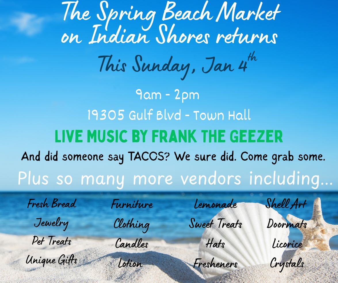 The Town of Indian Shores is excited to announce the return of the Spring Beach Market, kicking off this Sunday, January 4, 2026..