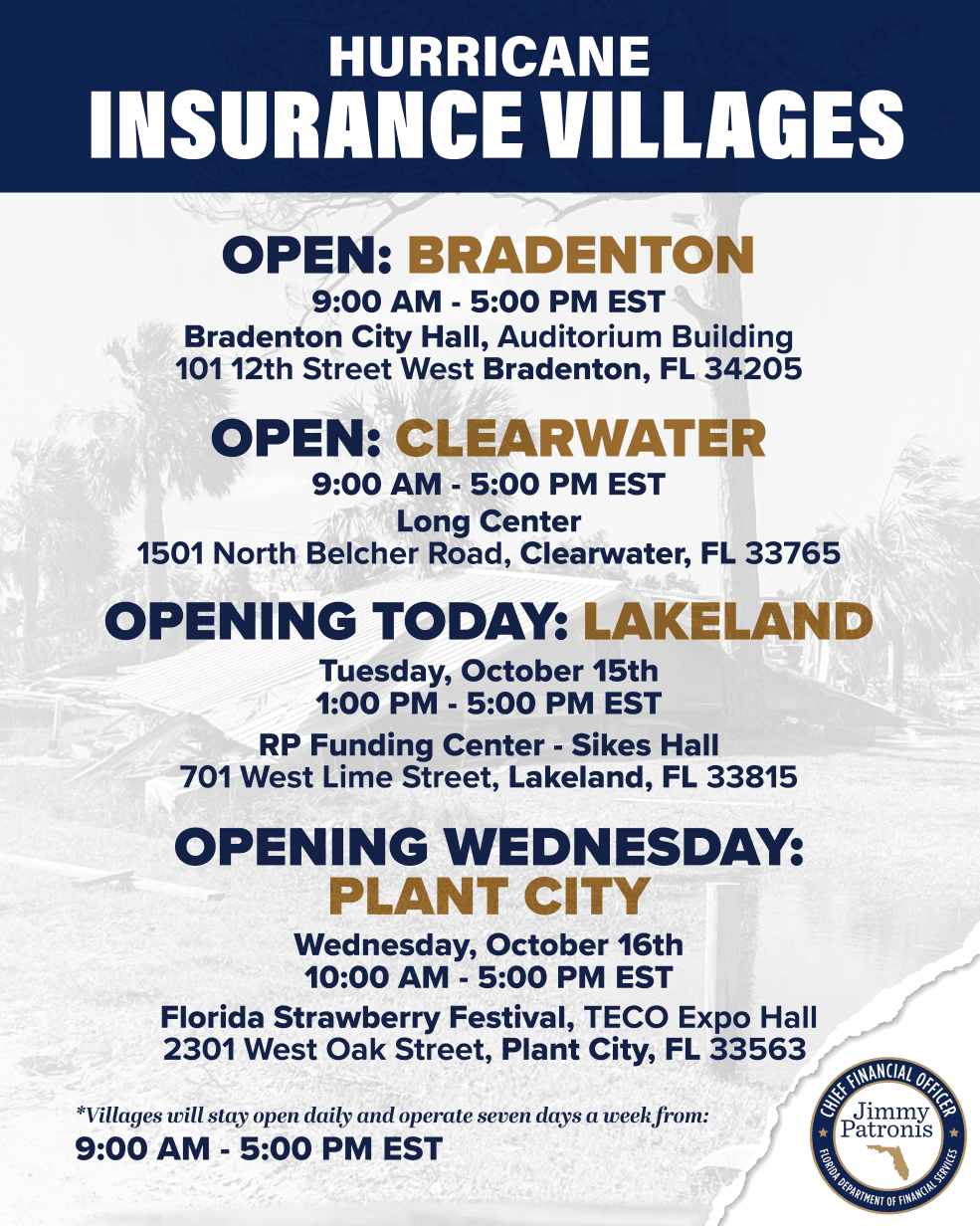 Florida has opened four “insurance villages” around the Gulf Coast to help people dealing with damage from Hurricane Milton and Hurricane Helene. See flyer below for more details.