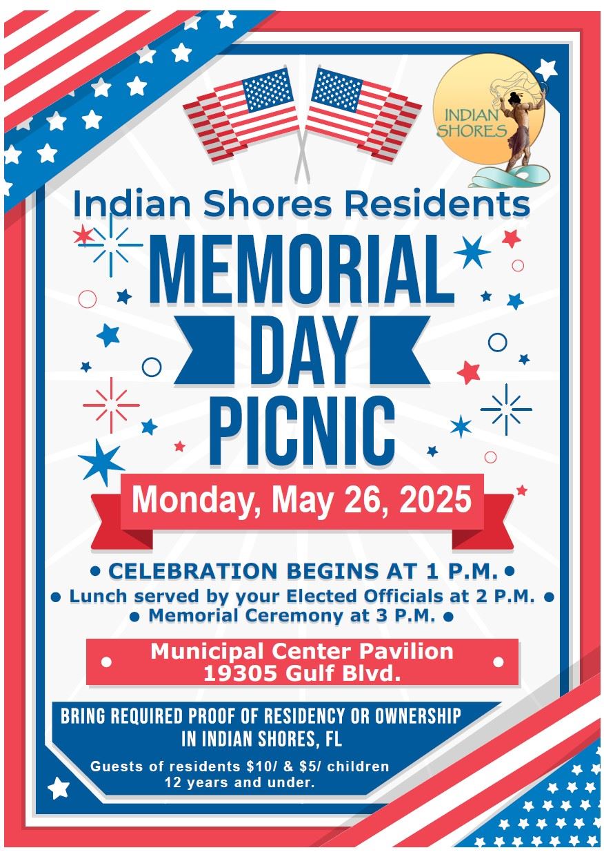 Come join us at the Pavilion behind Town Hall for the Indian Shores Memorial Day picnic where there will be music and picnic style lunch served by your Elected Officials. At 3:00 P.M., there will be a special Memorial Ceremony to honor all Military Personnel who made the ultimate sacrifice for our country.