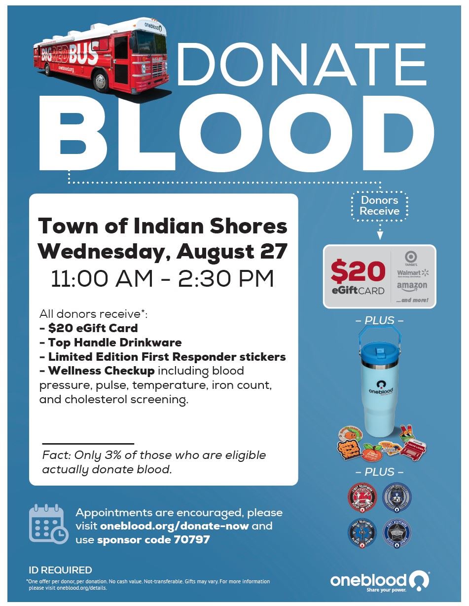 The Big Red Bus will be at Indian Shores on Wednesday, August 27th between 11:00 a.m. and 2:30 p.m. All successful donors will receive a $20 eGift card, top handle drinkware, limited edition First Responder stickers, and a free wellness checkup.