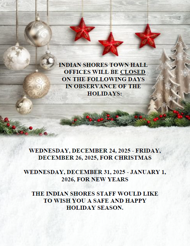 The Indian Shores Town Hall will close from Wednesday, 12/24 - Friday, 12/26 for the Christmas Holiday and Wednesday, 12/31 - Thursday, 1/1 for the New Year's Holiday.